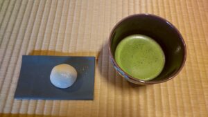 風炉の薄茶点前にて、秋草や兎をあしらった茶碗、水面に映る月を思わせる菓子、濃紺の懐紙など、秋の情景を映したお道具を楽しんでいただきました。